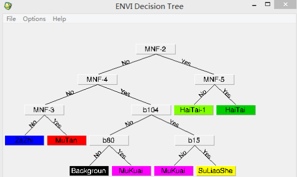 根據(jù)2和3可知,運(yùn)用MNF和監(jiān)督分類方法雖然能較好地識別出海苔,但是單個(gè)MNF波段只能識別出少量的雜質(zhì),且位置雜質(zhì)屬性,監(jiān)督分類雖然能識別較多的雜質(zhì),但是需要選擇訓(xùn)練樣本,且運(yùn)行時(shí)間較長,并不適合未來產(chǎn)業(yè)化的發(fā)展。因?yàn)楸狙芯刻接懢C合使用不同物質(zhì)的光譜特征及其MNF波段,運(yùn)用決策樹分類方法快速識別海苔、雜質(zhì)、背景。