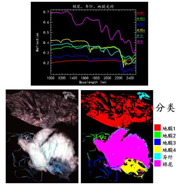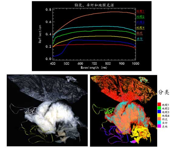 圖3為棉花與各種不同地膜在400-1000nm波長范圍內(nèi)的光譜反射率曲線,從其反射率曲線來看,棉花的光譜反射率最高,其他依次是異纖、地膜2、地膜4、地膜1或地膜3。棉花的光譜反射率與地膜1、地膜2、地膜4和異纖的光譜反射率變化趨勢相似,地膜3在400-550nm之間與棉花的光譜反射率相差較大。因此在光譜判別的過程中,棉花可能會存在錯分為地膜1、地膜2、地膜4以及異纖的可能。圖3下圖為利用400-1000nm光譜范圍對棉花、地膜和異纖的分類研究,從分類結(jié)果來看,邊緣部分棉花被錯分為地膜1,中間部分棉花有一些被錯分為異纖,而地膜2、地膜3和地膜4有較好的區(qū)分度。