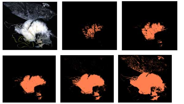 同樣,我們運用光譜角匹配算法對圖像、的棉花快速判別,下圖為不同光譜匹配角下棉花的判別效果圖(從左到右匹配角分別是0.04、0.08、0.1)。從判別效果來看,在匹配角為0.04的情況下存在少量的異纖被錯分為棉花,但很多棉花卻沒有被判別出來;在匹配角是0.08和0.1的情況下,雖然大部分棉花被識別出來,但是更多的異纖則被錯誤的判為棉花。另外利用光譜角匹配算法判別棉花,四種不同的地膜沒有被判別為棉花,這是因為這四種地膜在短波紅外范圍內(nèi),其光譜曲線變化趨勢與棉花不同,但異纖的光譜曲線變化趨勢與棉花相近,由此可見光譜匹配角比較適合于不同種類的目標物的判別,則光譜曲線變化趨勢不能一致。