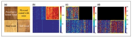 圖1. 四種木材廢料的RGB圖像和由每個分類模型計算的偽彩色圖像:(a)四種木材廢料的可見光圖像;(b)涂樹脂膠合板分類的得分圖像;(c)防腐處理木材分類的得分圖像;(d)軟木分類的得分圖像