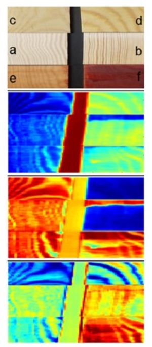 圖4. 原圖(第1幅圖)和主成分分析(PCA)處理后的高光譜圖像。分別為***主成分(第2幅圖)、第三主成分(第3幅圖)和第四主成分(第4幅圖)。圖像展示了不同處理方式下的木材樣本,包括:干燥未處理松木(a)、潮濕未處理松木(b)、干燥硼鹽處理松木(c)、潮濕硼鹽處理松木(d)、干燥甲基托布津處理松木(e)以及潮濕甲基托布津處理松木(f)