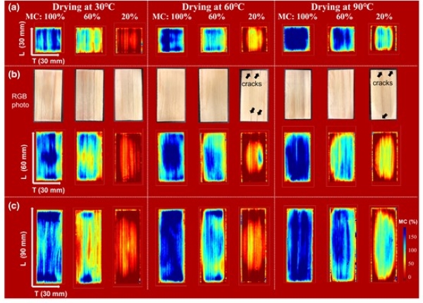 Ma等人(Ma et al., 2022)利用NIR-HSI技術(shù)分析木材干燥過程中的水分傳輸動力學(xué),探討了木材中自由水和結(jié)合水的動態(tài)變化及其對干燥過程的影響。研究通過對不同長度(30 mm、60 mm、90 mm)的日本扁柏樣品在不同干燥溫度(30℃、60℃、90℃)下的含水率分布進行可視化分析(圖5),揭示了木材水分在干燥過程中的遷移機制。