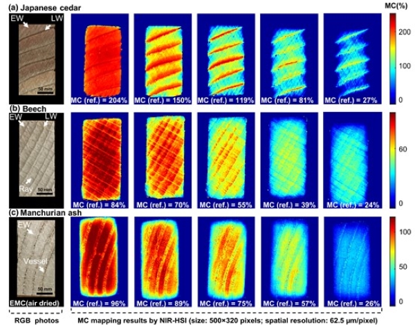 木材的含水率與化學(xué)成分是決定其加工性能與最終用途的重要參數(shù)。HSI技術(shù)通過結(jié)合光譜和空間信息,實現(xiàn)了木材中自由水、結(jié)合水及其遷移動力學(xué)的動態(tài)監(jiān)測,同時結(jié)合化學(xué)計量學(xué)模型能夠無損、快速地定量分析木質(zhì)素、纖維素及其他化學(xué)成分含量,生成高分辨率的二維或三維化學(xué)成分分布圖。
