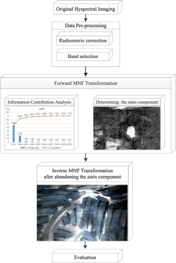 Hou等人提出了一種基于高光譜成像與最大噪聲分?jǐn)?shù)(MNF)變換的古代繪畫(huà)污漬虛擬修復(fù)方法。該研究的實(shí)驗(yàn)流程如圖2所示,該研究利用高光譜成像技術(shù)獲取繪畫(huà)數(shù)據(jù),通過(guò)正向MNF變換集中繪畫(huà)主要信息于少數(shù)主成分,并確定含污漬成分;再逆向變換剔除這些成分,實(shí)現(xiàn)污漬去除。實(shí)驗(yàn)證明,此方法能有效淡化或去除污漬,同時(shí)保持非污漬區(qū)域信息,最大程度還原畫(huà)作原始風(fēng)貌。