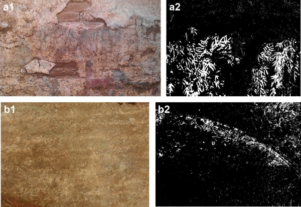 Pan等人提出了一種基于高光譜成像的空間-光譜特征結(jié)合方法,用于提取褪色壁畫(huà)中的目標(biāo)圖案。該方法結(jié)合輻射校準(zhǔn)、主成分分析去噪及歸一化比值指數(shù)(NRI)增強(qiáng)光譜特征,通過(guò)密度分割與掩模技術(shù)分離目標(biāo)區(qū)域。實(shí)驗(yàn)證明,其能高效提取壁畫(huà)中幾乎不可見(jiàn)的圖案(圖3),相比傳統(tǒng)方法,操作簡(jiǎn)便、客觀無(wú)損,適用于明顯光譜特征圖案提取,為壁畫(huà)數(shù)字化保護(hù)與研究提供了技術(shù)支持。