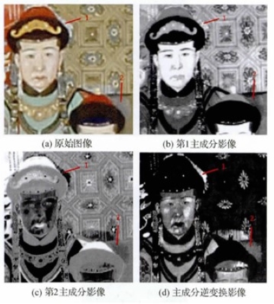 郭新蕾等人以《崇慶皇太后八旬萬(wàn)壽圖》為研究對(duì)象,利用短波紅外(1000~2500 nm)高光譜數(shù)據(jù)結(jié)合多種光譜匹配算法(如光譜角匹配、光譜信息散度)和主成分分析技術(shù),成功實(shí)現(xiàn)了顏料成分的精準(zhǔn)識(shí)別與分布分析,并通過(guò)背景剝離增強(qiáng)弱信息,提取了底層涂抹痕跡等隱藏信息。以圖4中人物頭冠為例,圖中所標(biāo)識(shí)的1、2分別為涂抹信息,經(jīng)過(guò)主成分分析可以發(fā)現(xiàn),涂抹痕跡得到了明顯加深,隱藏信息得到了有效提取。結(jié)果表明,高光譜技術(shù)在顏料混合分析和弱信號(hào)增強(qiáng)方面具有顯著優(yōu)勢(shì)?。