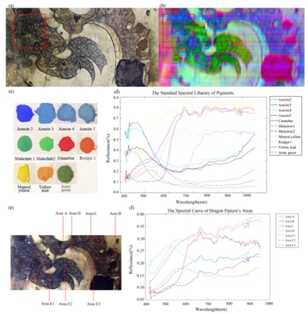 圖5.(a)展示了顏料層保存良好的夔龍紋圖案,作為研究對(duì)象;(b)通過(guò)PCA后的PC1、PC4和PC10波段合成的偽彩色圖像。偽彩色圖像區(qū)分了不同顏料區(qū)域,清晰顯示了圖案邊緣與顏色分布差異;(c,d)展示了礦物顏料光譜庫(kù),其中包含不同粒徑的光譜數(shù)據(jù);(e,f)展示了夔龍紋圖案中不同顏色塊的光譜曲線。通過(guò)對(duì)比標(biāo)準(zhǔn)光譜庫(kù),識(shí)別了各個(gè)區(qū)域的顏料成分