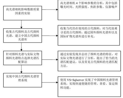 丁新峰等人使用高光譜成像技術(shù)對(duì)古代的顏料進(jìn)行無(wú)損鑒定研究,使用高光譜照相機(jī)采集字畫(huà)和壁畫(huà)數(shù)據(jù),通過(guò)構(gòu)建光譜數(shù)據(jù)庫(kù)和光譜匹配的技術(shù)對(duì)顏料進(jìn)行無(wú)損鑒定。該研究流程如圖6,首先控制并實(shí)驗(yàn)影響采集質(zhì)量的因素,總結(jié)高光譜照相機(jī)采集規(guī)范。隨后調(diào)研、查閱文獻(xiàn),收集并整理當(dāng)代仍在使用的古代顏料光譜。研究顏料光譜特征,分析光譜匹配算法,設(shè)計(jì)鑒定方法。最后,利用VS和SqlSever設(shè)計(jì)實(shí)現(xiàn)光譜軟件系統(tǒng),服務(wù)于未來(lái)顏料鑒定。
