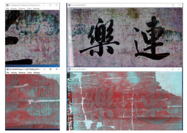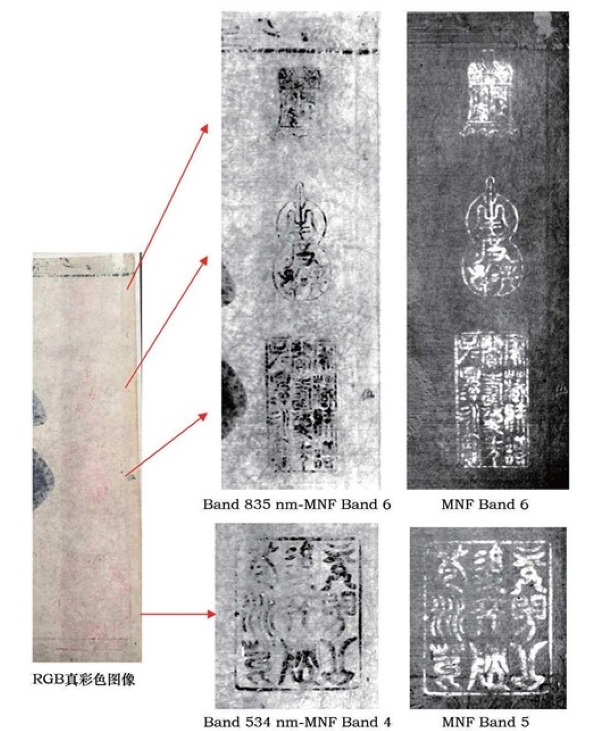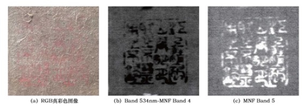 周新光等人研究了高光譜圖像系統(tǒng)在提取傳統(tǒng)書(shū)畫(huà)作品中模糊印章信息方面的應(yīng)用。文章采用350-1000 nm高光譜成像技術(shù),通過(guò)最小噪聲分離方法處理數(shù)據(jù),顯著提升印章辨識(shí)度(圖11)。該技術(shù)還能揭示修復(fù)痕跡,為印章真實(shí)性及文物藝術(shù)價(jià)值研究提供科學(xué)依據(jù),解決了模糊不清印章的辨識(shí)難題。