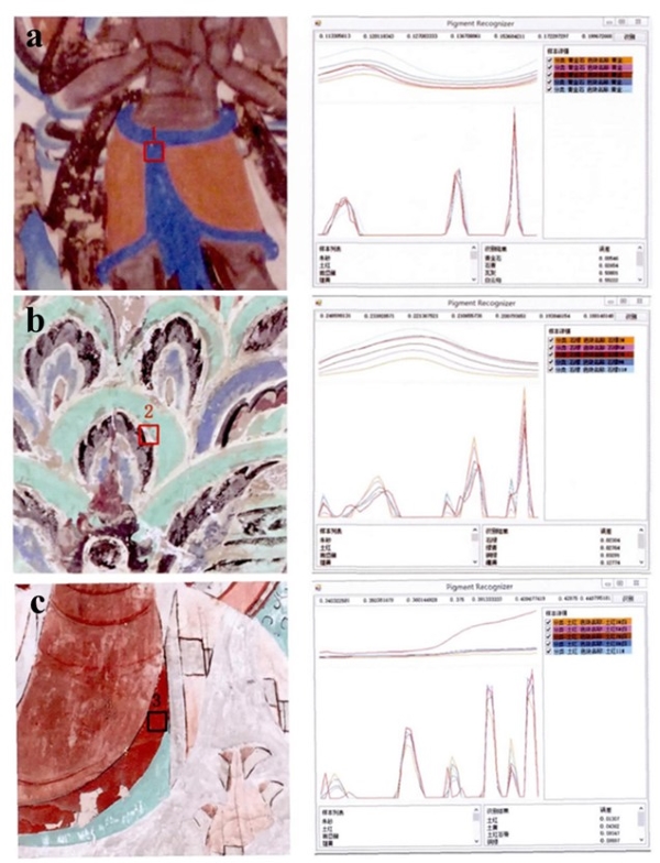 圖10.(a)249窟斗形頂正披阿修羅藍(lán)色顏料識(shí)別結(jié)果;(b)220窟南壁綠色顏料識(shí)別結(jié)果;(c)310窟北壁紅色顏料識(shí)別結(jié)果