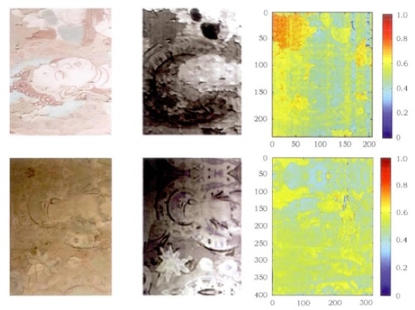 圖14.壁畫(huà)起甲風(fēng)險(xiǎn)評(píng)估圖。第一列為壁畫(huà)的彩色圖像,第二列為原始圖像的高光譜圖像示意圖,第三列為PLSR模型預(yù)測(cè)得到的風(fēng)險(xiǎn)評(píng)估圖