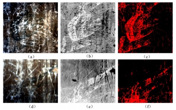Hou等人提出了一種利用高光譜成像技術(shù)從壁畫(huà)煙塵中提取隱藏信息的有效方法,以提高古代壁畫(huà)圖案的視覺(jué)價(jià)值。首先,采用最小噪聲分?jǐn)?shù)變換去除壁畫(huà)背景中的煙塵特征;其次,利用光譜特征分析和圖像減法對(duì)壁畫(huà)進(jìn)行特征增強(qiáng);最后進(jìn)行密度切片,提取煙塵下的圖案(圖15)。該方法對(duì)隱藏信息的提取準(zhǔn)確率達(dá)到了88.97%。