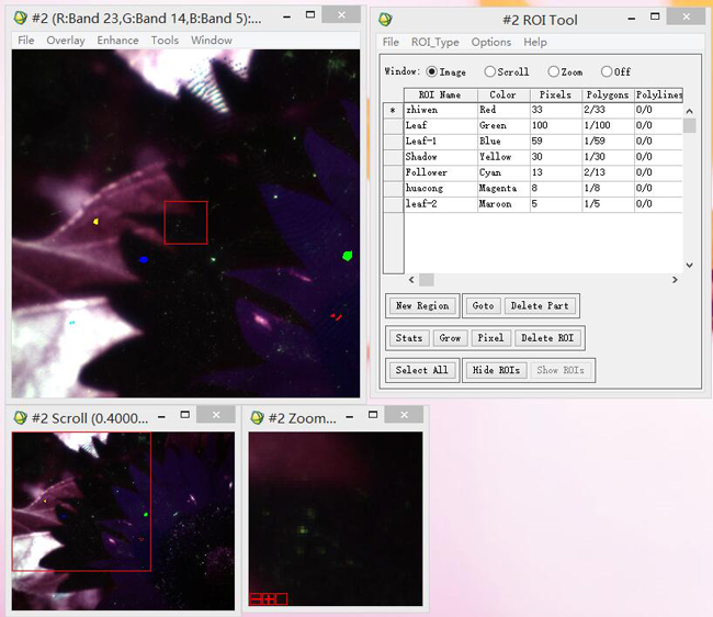 根據(jù)圖3,本研究選取了指紋、葉片-1、葉片-2、葉片-3、陰影、花、花叢共7個端元,其端元分布情況如圖4所示。