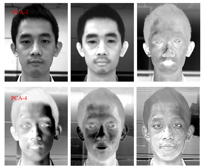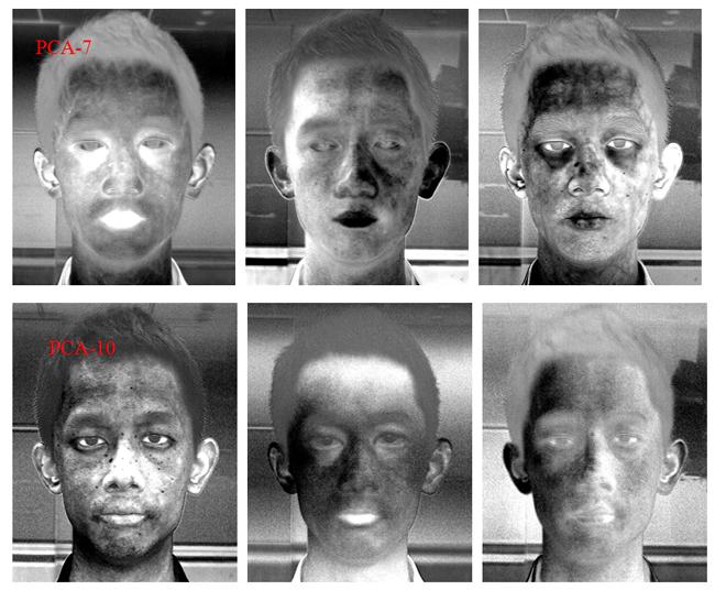 在本研究中,由于人臉在不同波長(zhǎng)下成像,得到幾百景人臉圖像,且在不同的波長(zhǎng)下人臉的灰度圖像顯示效果并不同,有的圖像清晰,有的圖像模糊,還有些基本上看不見。如果用計(jì)算機(jī)處理,會(huì)因?yàn)閳D像信息量太大而難以處理,浪費(fèi)時(shí)間過(guò)多。所以,需要經(jīng)過(guò)主成分分析法篩選出特征圖像。主成分分析(Principal Component Analysis, PCA)的作用是去除波段之間的多余信息、將多波段的圖像信息壓縮到比原波段更有效的少數(shù)幾個(gè)轉(zhuǎn)換波段下。圖10分別展示了人臉經(jīng)主成分變換后的15個(gè)主成分圖像,從圖10可知,前2個(gè)主成分雖然包含了較多信息,且圖像較為清晰,但黑痣的顯示效果并不理想。從圖10中我們可以發(fā)現(xiàn),第4、6和10主成分能較為清晰地人臉黑痣的分布情況。