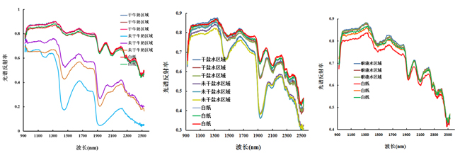 對獲取的高光譜圖像數(shù)據(jù)進行黑白幀校正得到圖像的光譜反射率數(shù)據(jù),同時對反射率數(shù)據(jù)進行壞點(NAN)進行修復(fù),剔除掉異常值,從而得到牛奶、飽和鹽水、眼液及背景(白紙)的光譜反射率數(shù)據(jù),如圖2所示。從圖2可知,干牛奶與未干牛奶,其在白紙上寫的字跡光譜反射率差異較大;當牛奶曬干后,字跡的光譜反射率與白紙十分相似,變化規(guī)律也趨向一致,對光譜進行放大分析可知,牛奶字跡的光譜反射率總體上高于白紙的光譜反射率。對于飽和鹽水字跡而言,干飽和鹽水字跡與未干飽和鹽水字跡在光譜反射率上差異較為明顯,特別是在水汽吸收帶1420 nm和1910 nm附近差異更為顯著;當飽和鹽水曬干后,飽和鹽水字跡的光譜反射率與白紙的光譜反射率變化趨勢一致,但是白紙的光譜反射率高于飽和鹽水字跡的光譜反射率。運用眼液在白紙上寫上字,待眼液曬干后,去牛奶字跡、鹽水字跡一樣,肉眼無法識別出是什么字,利用短波紅外相機測試其光譜反射率發(fā)現(xiàn),眼液曬干后,其字跡的光譜反射率與白紙的光譜反射率變化趨勢依然一致,但是眼液字跡的光譜反射率高于白紙的光譜反射率。