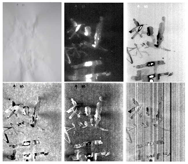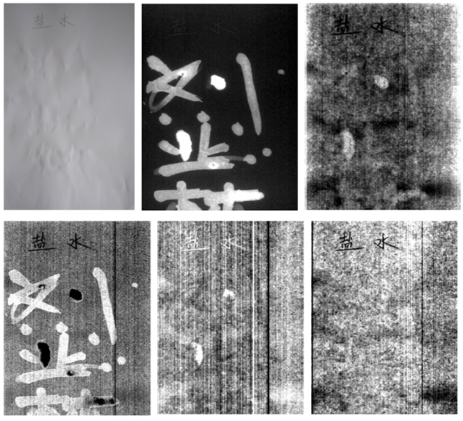 圖3列舉了牛奶隱形字原圖(手機拍攝)、MNF變換前5個成分。從圖中可知原圖看不到任何字跡模樣,但經(jīng)過MNF變換后,第1、2、3、4成分能較好地識別出隱形字跡,其中第2成分隱形字跡識別效果最佳。第1成分中隱形字較亮的部分是因為牛奶尚未完全風干,第2成分隱形字較亮、較暗的部分同樣是因為牛奶尚未完成風干,導(dǎo)致MNF變換中其信息較為顯著,如圖2可知干牛奶區(qū)域和未干牛奶區(qū)域的光譜反射率曲線差異較為顯著。第3、4、5成分隱形字的灰度不完全一致,也是因為牛奶未完全風干的原因。