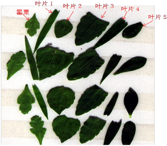 采摘罌粟及其周圍環(huán)境生長的五種不同植物的葉子若干,制作樣品。如圖1所示,第一列是罌粟葉子共4片葉子,第二列是植物1的葉子標(biāo)記為葉片1,共3片葉子,同樣方法,第三列是葉片2共4片葉子,第四列是葉片3共4片葉子,第五列是葉片4共4片葉子,第六列是葉片5共4片葉子。葉片1, 2, 3, 4, 5分別采摘于罌粟周圍環(huán)境生長的其他五種植物。葉片用雙面膠固定在泡沫板上。
