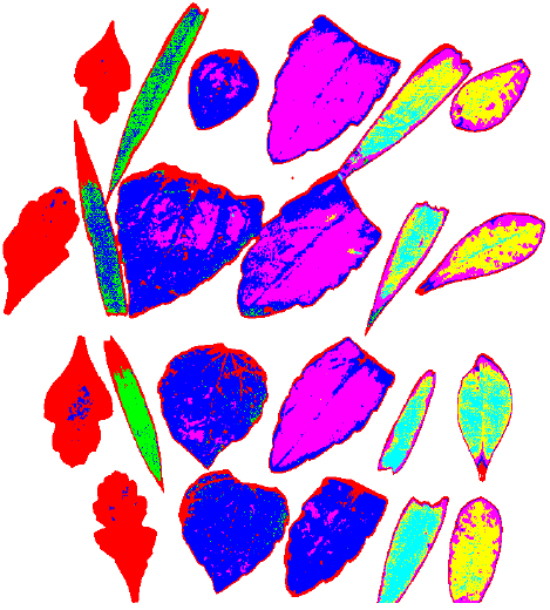 上述實(shí)驗(yàn)是把罌粟和其他樹葉分開擺放,平鋪在泡沫板上進(jìn)行光譜成像的,是在己知罌粟及其他植物葉片的光譜特征情況下,通過“光譜分類”的功能將不同植物葉片加以區(qū)分,并以不同的偽彩色顯示。但在實(shí)際的場景中,罌粟通常是種植在雜草叢生的山地里或套種在莊稼地里。實(shí)際上,我們難以獲得所有與罌粟生長環(huán)境相同的所有植物的光譜特征,因而我們需要在實(shí)驗(yàn)室下對真實(shí)環(huán)境進(jìn)行模擬實(shí)驗(yàn):即罌粟葉片混雜在其他各種不同植物的葉片之中,如圖4所示。