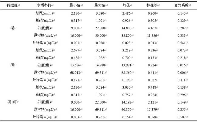 表1 湖泊、河流水質(zhì)參數(shù)的統(tǒng)計(jì)參數(shù)