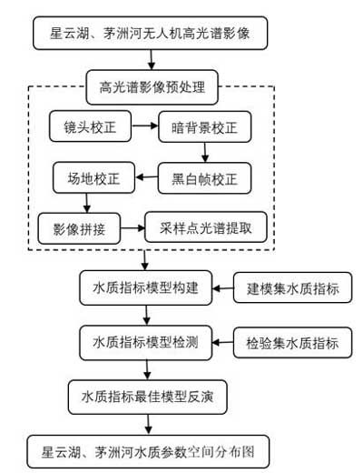 本研究以云南玉溪市星云湖和深圳市茅洲河為研究區(qū),利用無人機(jī)高光譜技術(shù)構(gòu)建水質(zhì)參數(shù)如總氮、總磷、懸浮物、濁度、葉綠素a的監(jiān)測模型,將最優(yōu)的監(jiān)測模型反演到無人機(jī)高光譜影像上制作總氮、總磷、懸浮物、濁度、葉綠素a的空間分布圖。具體計(jì)算路線如圖2所示。