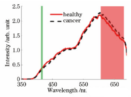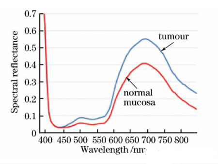 圖 顯示了正常粘膜組織和腫瘤組織的光譜反射曲線。
