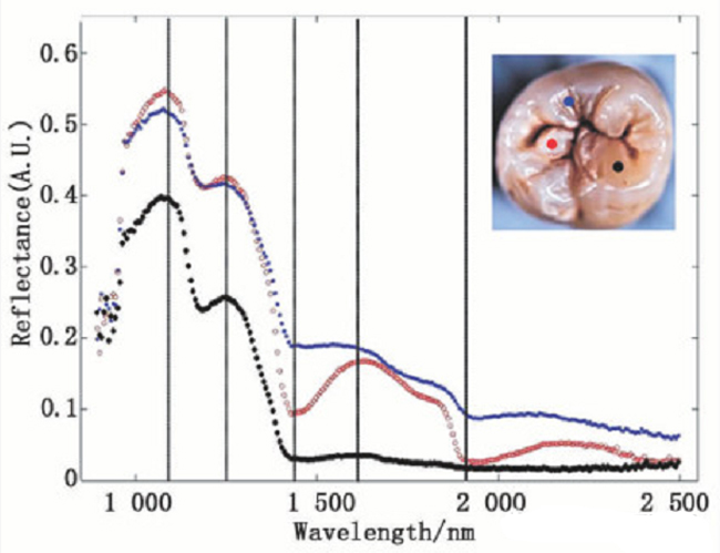 圖2 牙齒表面的近紅外光譜反射率曲線(紅色表示病變區(qū)域,藍(lán)色表示損傷區(qū)域,黑色為健康區(qū)域)