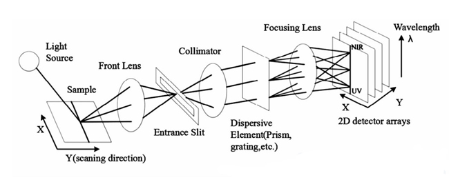 高光譜成像技術(shù)(HSI)是一種結(jié)合成像和光譜的混合模式,通過在二維檢測器陣列的每個(gè)像素處收集光譜信息,產(chǎn)生空間和光譜信息的三維數(shù)據(jù)集。