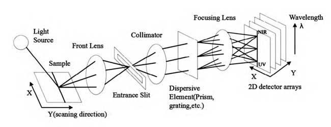 高光譜成像技術是利用成像光譜儀對目標物體在光譜覆蓋范圍內(nèi)的數(shù)十或數(shù)百條譜線進行連續(xù)掃描成像,在獲得目標物體外部特征圖像信息的同時,也能獲得反應其內(nèi)部成分的光譜信息。典型推掃式高光譜成像系統(tǒng)的結構如圖 1 所示,主要由光源、電控移動臺、色散元件、面陣探測器等幾部分組成。