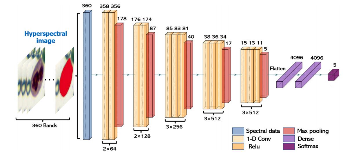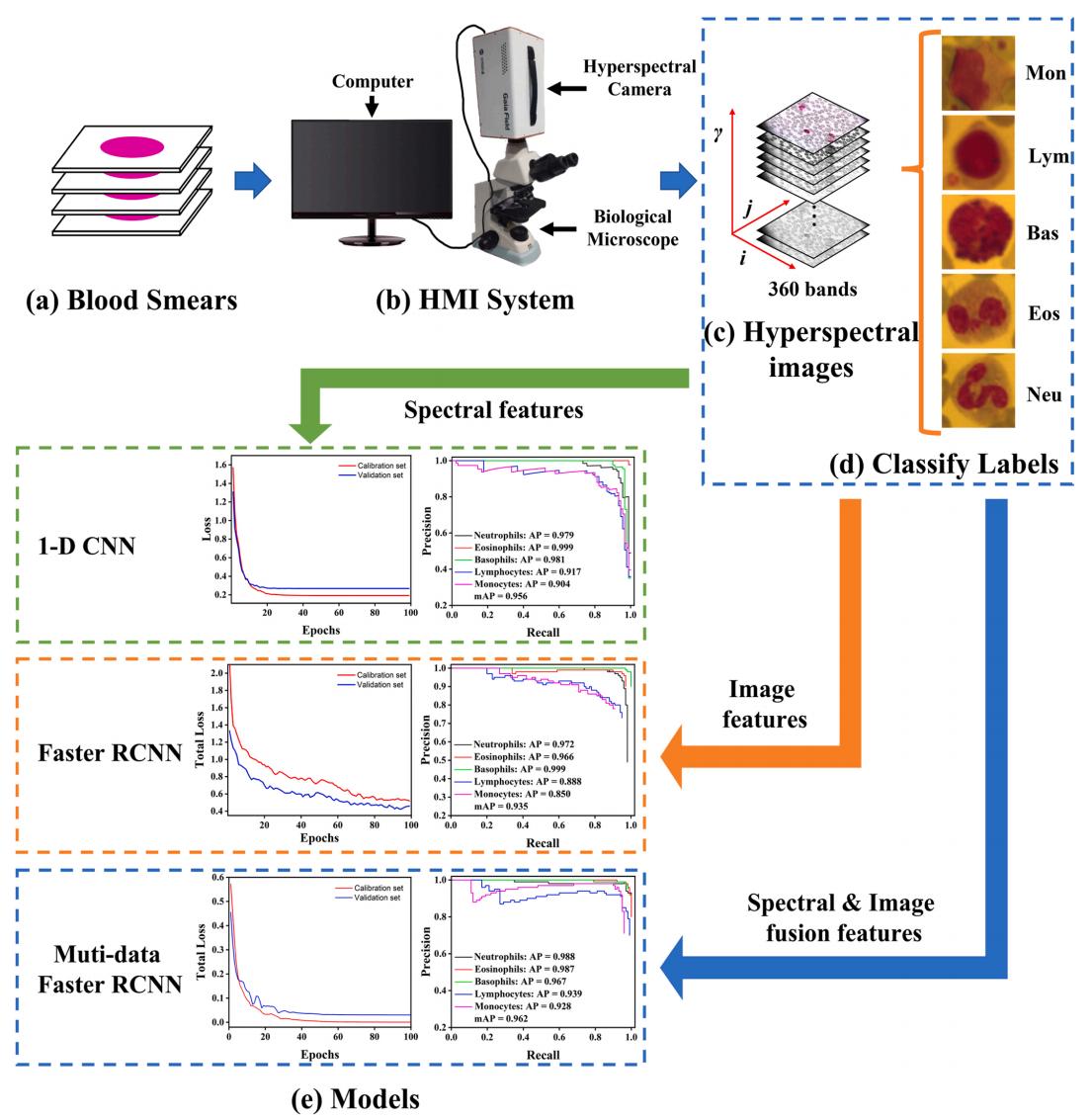 具體研究內(nèi)容如下:(1)利用高光譜顯微成像(Hyperspectral microscopic imaging, HMI)系統(tǒng)獲取血液涂片中含有白細(xì)胞區(qū)域的影像,并對每種類型的白細(xì)胞進(jìn)行標(biāo)記,形成五種分類的數(shù)據(jù)集。(2)根據(jù)VGG16網(wǎng)絡(luò)架構(gòu)構(gòu)建一維CNN網(wǎng)絡(luò),并基于WBC的光譜數(shù)據(jù)進(jìn)行相應(yīng)的訓(xùn)練和預(yù)測,驗(yàn)證光譜數(shù)據(jù)作為WBC分類依據(jù)的可行性。(3)與一維CNN相似,采用Faster RCNN作為對照組,基于偽彩色圖像對WBC進(jìn)行識別分類,觀察基于單一數(shù)據(jù)的分類準(zhǔn)確率。(4)最后,構(gòu)建了基于圖像和光譜特征的多數(shù)據(jù)Faster RCNN深度學(xué)習(xí)模型,并探討多數(shù)據(jù)聯(lián)合在白細(xì)胞檢測中的可行性和優(yōu)勢。