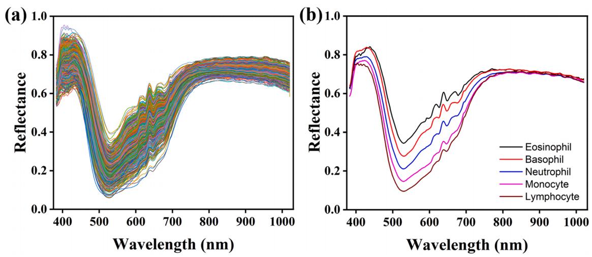 圖5所有WBC(a)和五種WBC(b)的平均光譜反射率曲線