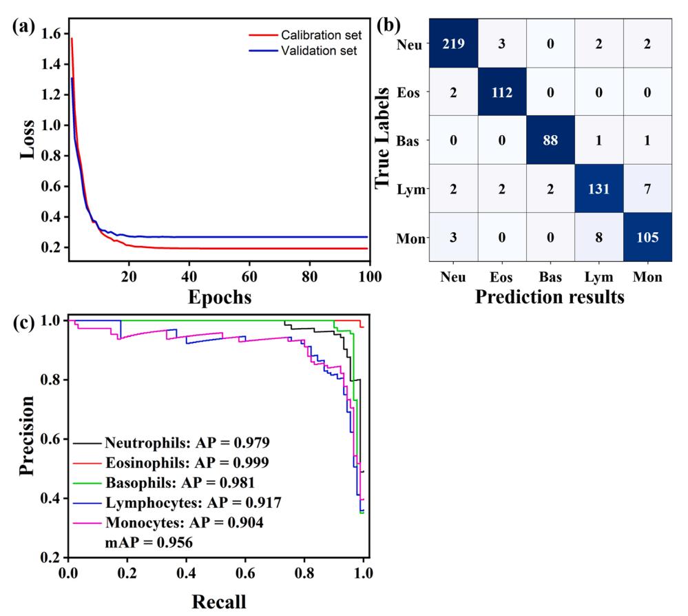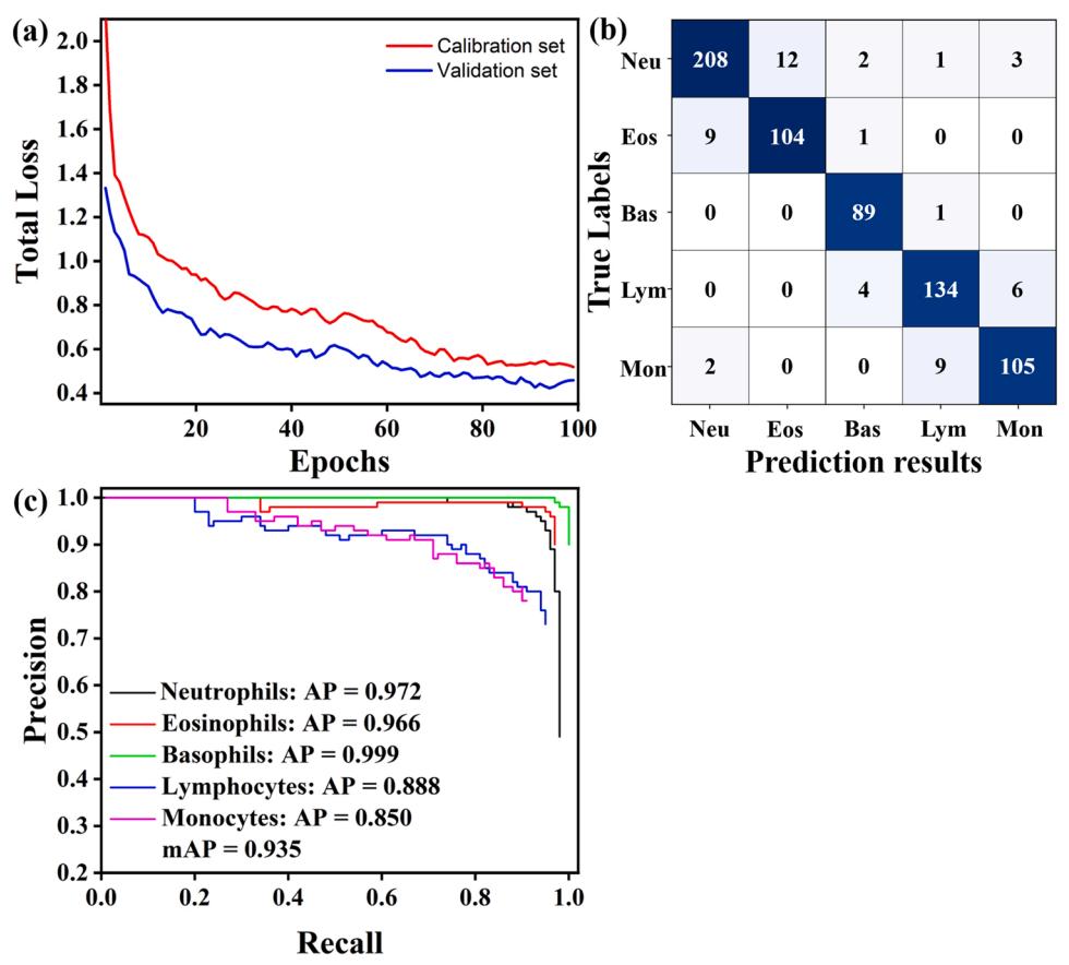 圖11詳細(xì)展示了多數(shù)據(jù)Faster RCNN的分類結(jié)果。當(dāng)?shù)螖?shù)達(dá)到40次時,校準(zhǔn)集和驗(yàn)證集的總損失值分別下降0.008和0.03,然后趨于穩(wěn)定,證明模型訓(xùn)練效果良好。與前兩種模型相比,Lym或Mon的分類精度有所提高。此外,各類別之間的混淆較少,表明該模型的預(yù)測能力得到了提高。從圖11c和表1可以看出,Lym和Mon的AP值改善最為明顯,分別達(dá)到0.917和0.911。融合特征的分類不僅減少了白細(xì)胞之間的誤判,而且有效地減少了背景與白細(xì)胞目標(biāo)之間的誤判。證明了多數(shù)據(jù)聯(lián)合檢測相對于單一數(shù)據(jù)檢測的可行性和優(yōu)勢。