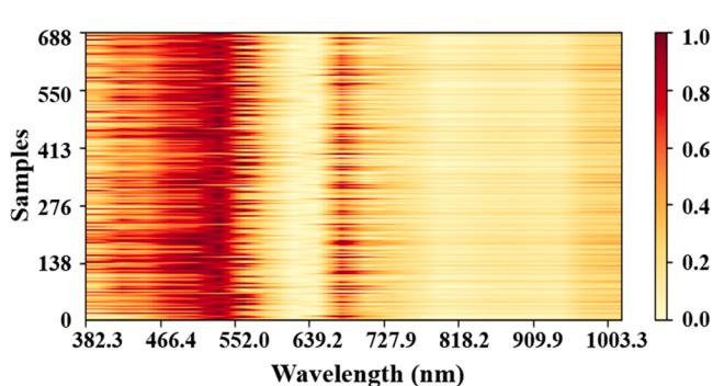 大連工業(yè)大學(xué)王慧慧教授團(tuán)隊(duì)使用如圖1b所示的HMI系統(tǒng)采集血液圖片的高光譜數(shù)據(jù)。它由一個image-λ -N17E近紅外高光譜成像系統(tǒng)(江蘇雙利合譜公司)和一個三目生物顯微鏡(Nikon Eclipse 80i)和鹵光源組成。高光譜數(shù)據(jù)的波長范圍為382.3 ~ 1020.2 nm,光譜分辨率為1.8 nm。