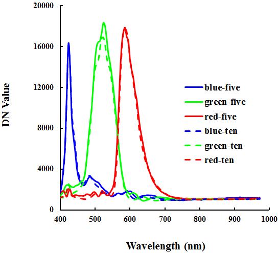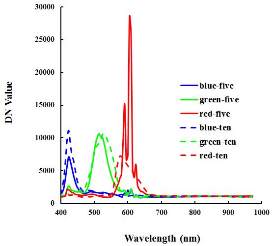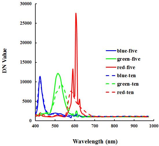2.3華為p8、iphone 5S、iphone 6 plus在顯微放大5倍、10倍條件下,其在紅綠藍(lán)三顏色的光譜變化