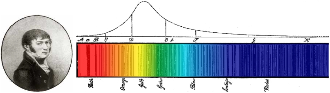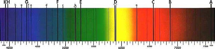 圖2.夫瑯禾費(fèi)暗線:太陽表層元素和地球大氣的吸收,到達(dá)地表的太陽光譜存在許多波段寬度為0.1~10 nm的暗線