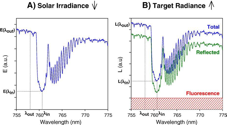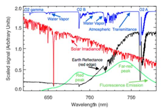 葉綠素?zé)晒夥瓷涔庾V的波段常與太陽輻射在紅光和近紅外的3個主要的吸收波段(即656.3nm處的太陽大氣的氫吸收線,687和760nm波段處的地球大氣層氧吸收線)相互重疊。687nm和760nm附近的氧氣吸收線形成的夫瑯禾費(fèi)暗線較明顯,熒光強(qiáng)度高。大氣中的氧分子在760nm波段附近形成了