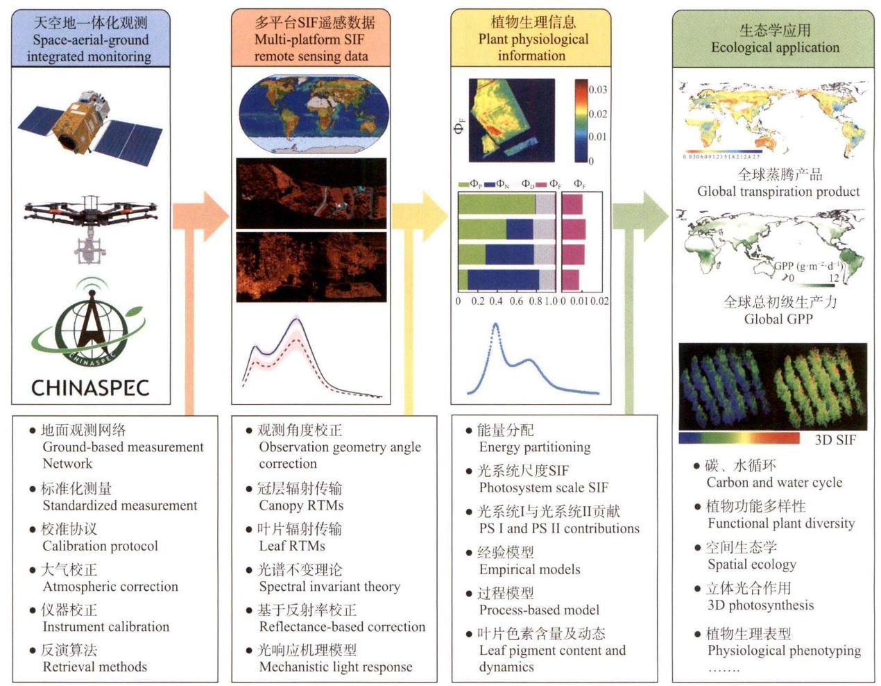 近十年來,日光誘導(dǎo)葉綠素?zé)晒猓⊿IF)遙感具有直接探測植 被光合作用的優(yōu)勢,成為植被遙感領(lǐng)域*具突破性的研究前沿之一,為陸地生態(tài)系統(tǒng)監(jiān)測提供了新思路和新手段。葉綠素?zé)晒馐侵参镞M(jìn)行光合作用過程中由光系統(tǒng)反應(yīng)中心激發(fā)出來的光譜信號。SIF技術(shù)突破了傳統(tǒng)主動熒光觀測的空間尺度瓶頸,實(shí)現(xiàn)了從葉片、冠層到全球尺度的植物光合作用觀測。 如圖2所示,在生態(tài)學(xué)、地理學(xué)、遙感科學(xué)和大氣科學(xué)等多學(xué)科融合的基礎(chǔ)上,隨著“天空地”一體化(近地面、機(jī)載和衛(wèi)星)SIF遙感數(shù)據(jù)的豐富以及SIF機(jī)理研究的推進(jìn),SIF遙感技術(shù)目前已被廣泛應(yīng)用于精確估算生態(tài)系統(tǒng)過程中的關(guān)鍵生理生化參數(shù)、植被總初級生產(chǎn)力(GPP)和及時監(jiān)測植物脅迫、物候和蒸騰作用等生態(tài)系統(tǒng)過程。