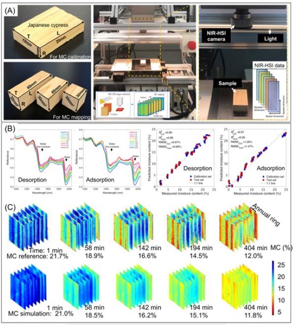 圖7.(A)木材樣本與近紅外高光譜成像(NIR-HSI)系統(tǒng);(B)從木材樣本的水分解吸和吸附過程中采集的HSI數(shù)據(jù)中提取的平均NIR光譜,以及NIRS預(yù)測(cè)的含水率(MC)與參考值之間的散點(diǎn)圖;(C)含水率的可視化結(jié)果(上圖)和在纖維飽和點(diǎn)(FSP)下進(jìn)行水分解吸時(shí)的模擬結(jié)果(下圖),樣本尺寸為30 mm³