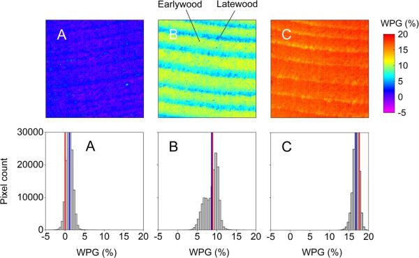 圖10.預(yù)測(cè)WPG的可視化圖像(上圖)及對(duì)應(yīng)的像素直方圖(下圖)。(a)未乙?;瘶悠?;(b)設(shè)計(jì)中心區(qū)域乙酰化樣品;(c)高度乙?;瘶悠?/span>