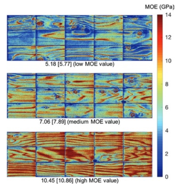 木材的物理性能,如彈性模量(MOE)、密度、微纖維角(MFA)等,是評(píng)價(jià)其力學(xué)性能和適用范圍的關(guān)鍵指標(biāo)。HSI技術(shù)通過與多元回歸模型的結(jié)合,能夠高效預(yù)測(cè)木材物理性能,并以圖像形式展示其在微觀或宏觀尺度上的分布特點(diǎn)。此外,NIR-HSI還可用于分析結(jié)疤、孔洞等內(nèi)部缺陷對(duì)木材性能的影響,為木材選種、加工和質(zhì)量控制提供科學(xué)依據(jù)。