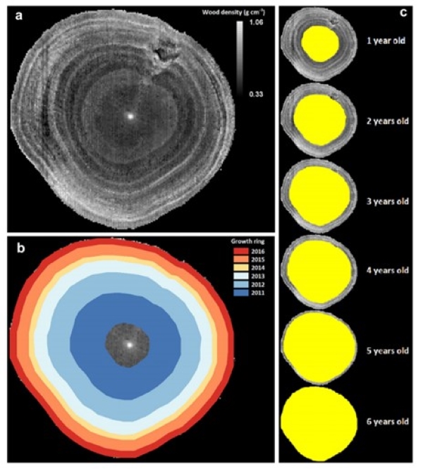 圖13.LWPLSR模型預(yù)測(cè)的木盤密度圖(a)、年輪(b)和每年齡的橫向面積劃分(c)