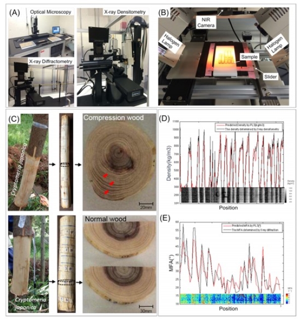 圖14.(A)SilviScan;(B)NIR-HSI系統(tǒng);(C)木材樣品(D)密度;(E)微纖維角的測(cè)繪結(jié)果