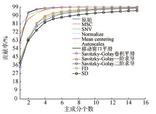 圖3 不同光譜預(yù)處理的前15個(gè)主成分累計(jì)貢獻(xiàn)率