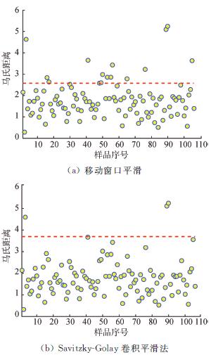 隨后采用SG卷積平滑法與移動(dòng)窗口平滑法這兩種光譜預(yù)處理方法的前4個(gè)主成分對(duì)馬氏距離進(jìn)行計(jì)算。其中SG卷積平滑法剔除3個(gè)異常樣本(最佳閾值為2.2),移動(dòng)窗口平滑法剔除15個(gè)異常樣本(最佳閾值為0.9),如圖4所示。