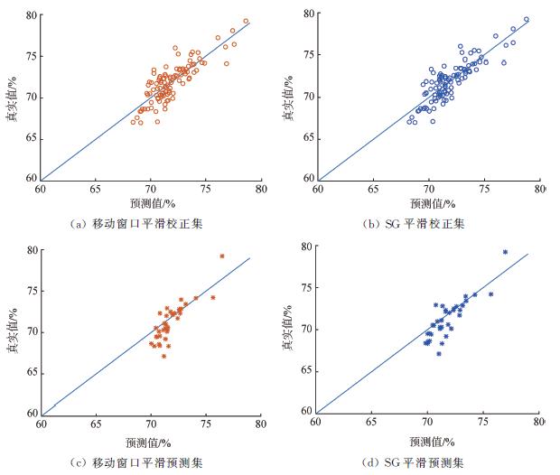 圖5 移動(dòng)窗口平滑和Savitzky—Golay卷積平滑的預(yù)測(cè)值和真實(shí)值之間的關(guān)系