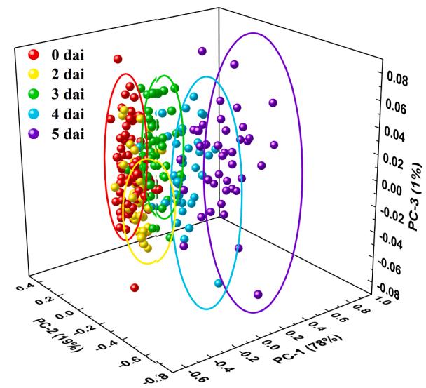 獲取小麥白粉病高光譜時序響應特征(圖2)。隨后利用主成分分析(PCA)觀察不同感染階段樣本間的區(qū)分能力,觀測分析了不同染病階段樣本的分類散點圖(圖3)、主成分特征圖像與載荷曲線(圖4)