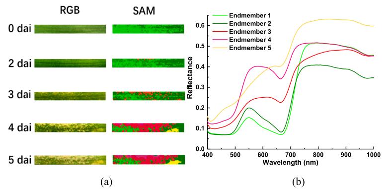 將高光譜圖像的光譜和紋理特征融合,建立PLS-DA模型。融合數(shù)據(jù)每個樣本產(chǎn)生21個變量,包括12個特征波長和9個紋理特征。校正和交叉驗證的總分類精度分別為97.7%和93.8%,在驗證集的預測中,總分類準確率高達91.4%。此外,借助光譜角映射(SAM)方法進行不同染病階段的病斑識別,實現(xiàn)了小麥白粉病發(fā)病過程可視化監(jiān)測(圖7)。