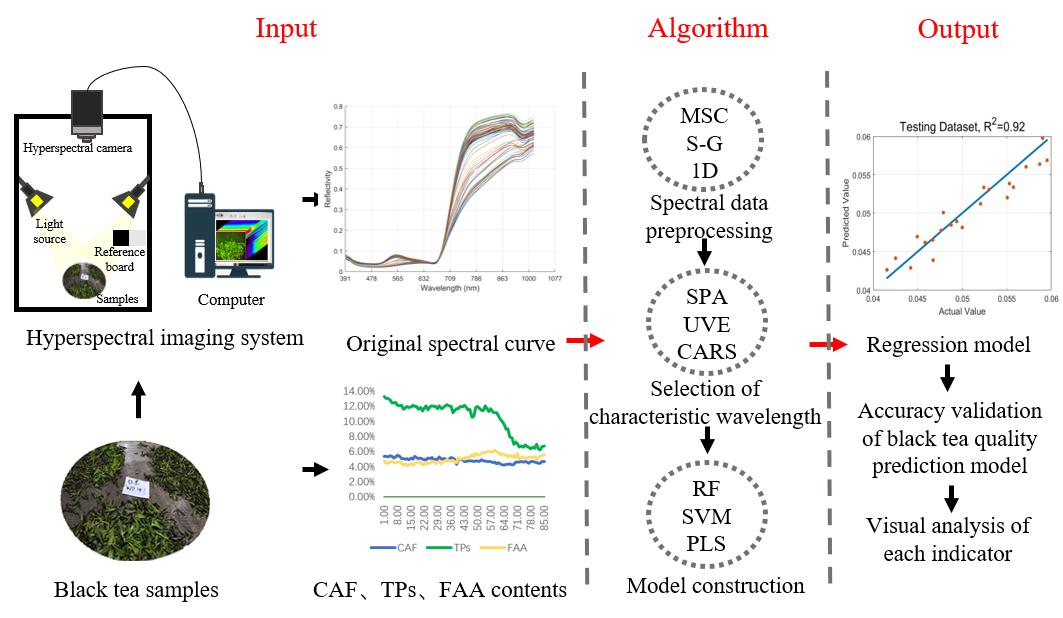 山東農(nóng)業(yè)大學(xué)丁兆堂教授團(tuán)隊(duì)利用我司高光譜成像設(shè)備(Gaia field Pro-V10),采集了茶鮮葉萎凋和發(fā)酵過程中的高光譜數(shù)據(jù),同時(shí)測(cè)定了各茶葉樣本中的TPs(茶多酚)、FAA(游離氨基酸)和CAF(咖啡因)含量;采用卷積平滑法、多元散射校正和一階導(dǎo)數(shù)算法對(duì)高光譜數(shù)據(jù)進(jìn)行預(yù)處理;通過機(jī)器學(xué)習(xí)和多種算法構(gòu)建了TPs、FAA和CAF含量的監(jiān)測(cè)模型。試驗(yàn)流程如圖1所示: