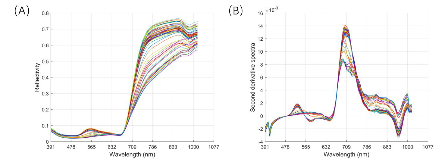 (A)茶葉樣本原始光譜圖 (B)MSC+1D+S-G算法預(yù)處理后的光譜圖