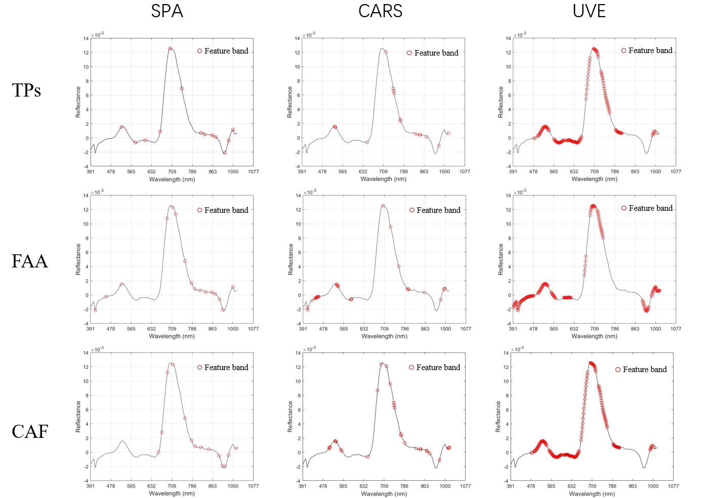 圖2表示高光譜數(shù)據(jù)預(yù)處理前后的光譜圖,提高了光譜數(shù)據(jù)與茶葉品質(zhì)成分之間的相關(guān)性。然后采用連續(xù)投影算法(SPA)、競(jìng)爭(zhēng)性自適應(yīng)重加權(quán)(CARS)和無信息變量消除(UVE)方法,選擇特征波段。特征波段的篩選結(jié)果如圖3所示。