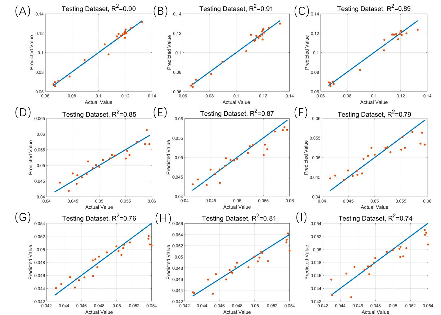 (A、B、C)通過CARS-SVM、CARS-PLS、CARS-RF模型獲得的TPs含量預(yù)測(cè)結(jié)果 (D、E、F)通過CARS-SVM、CARS-PLS、CARS-RF模型獲得的FAA含量預(yù)測(cè)結(jié)果 (G、H、I) 通過CARS-SVM、 CARS-PLS、CARS-RF模型獲得的CAF含量預(yù)測(cè)結(jié)果